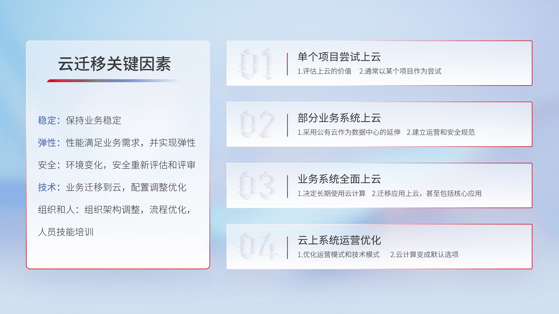 结合实际业务,,从规划设计、、、、云平台选型、、云原生改造、、、、数据迁移、、、、集成交付,,迁移全过程为客户识别最佳上云路径,,做好风险识别管理,,,设计网络架构、、、身份权限、、、、安全审计合规、、、操作审计、、日志审计、、、监控告警策略、、、、多站点容灾设计等,,对云上基础设施进行整体规划,,,提升IT治理水平,,,,以满足弹性、、、、高可用、、、、高性能的需求。。