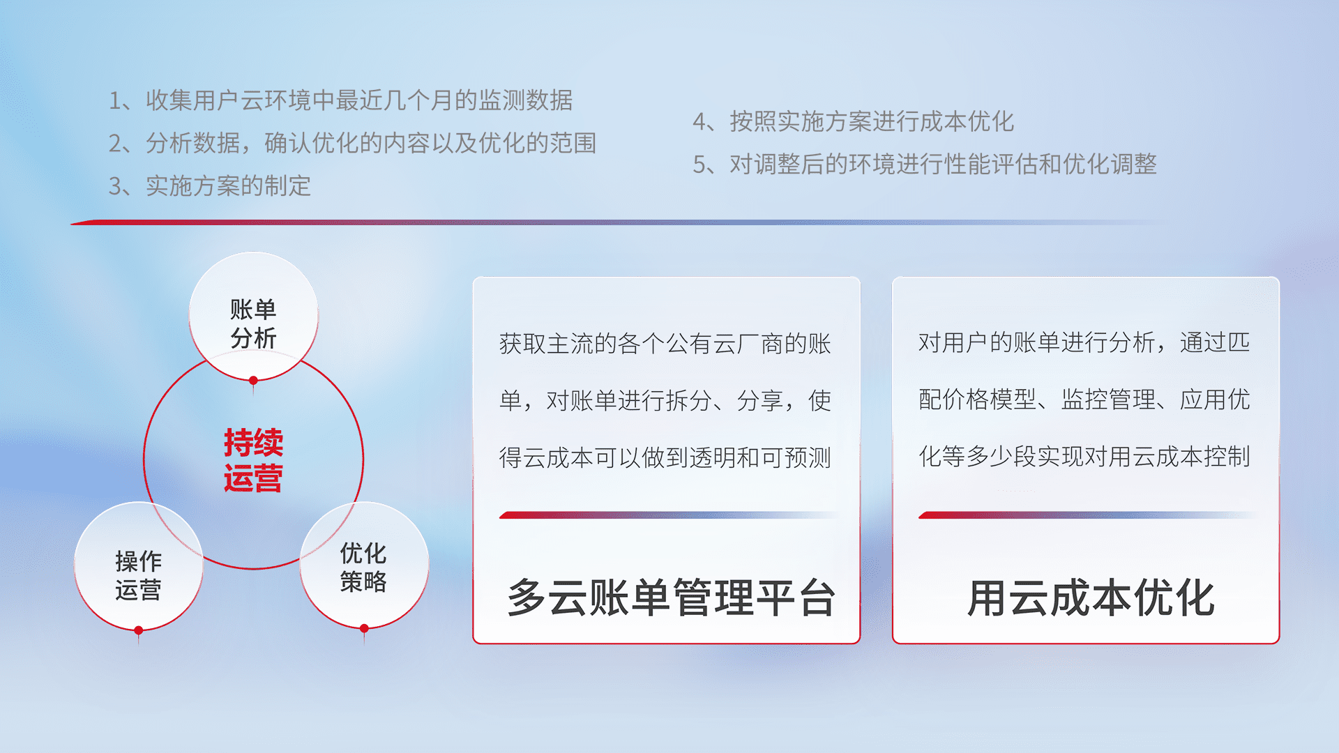 通过多云纳管,,,以统一的资源数据模型把客户的云资源进行抽象和封装,,,,进而实现对多云资源的统一操作,,保障云资源管理的可靠性、、稳定性与可用性。。量身定制化运维内容,,,配置、、、、开发运维、、、补丁管理、、、备份、、监控、、、、认证和访问管理、、、审计和日常巡检等,,,,保障在用云过程中的可靠度,,,稳定度以及高可用率。。